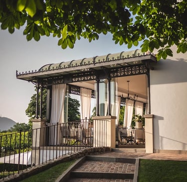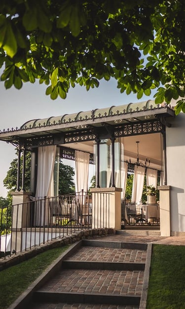 Once known for its healing springs, the estate has grown into an elegant villa set within a Romantic park dotted with thermal lakes.